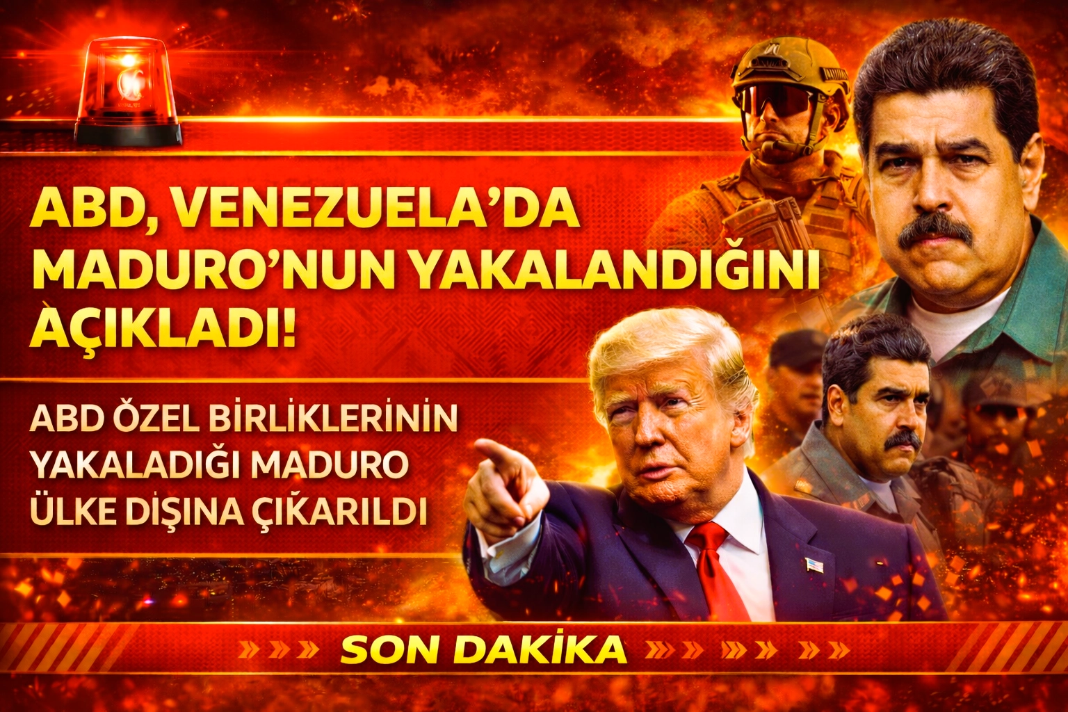 Venezuela’da son günlerde devam eden patlamalar ve askeri hareketlilik sonrası, Devlet Başkanı Nicolás Maduro'nun ABD özel kuvvetlerince ele geçirildiği resmi olarak duyuruldu. ABD Başkanı Donald Trump, operasyonun ABD güçleri tarafından gerçekleştirildiğini ve Maduro'nun ülke dışına çıkarıldığını açıkladı.